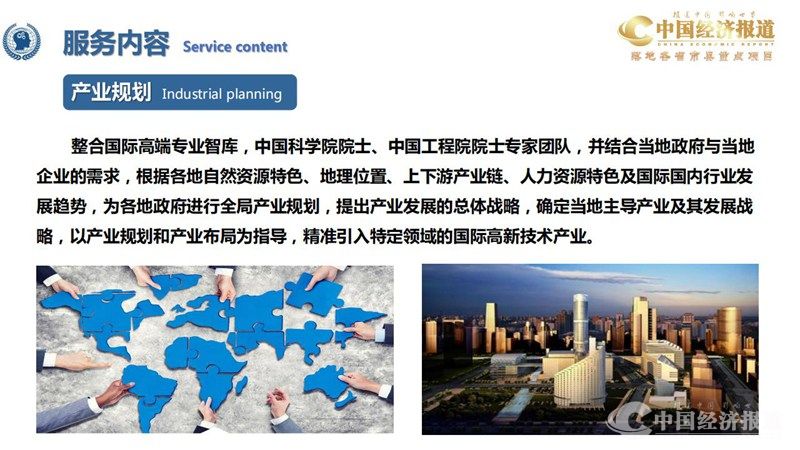 整合国际高端专业智库,中国科学院院士、中国工程院院士专家团队,并结合当地政府与当地 企业的需求,根据各地自然资源特色、地理位置、上下游产业链、人力资源特色及国际国内行业发 展趋势,为各地政府进行全局产业规划,提出产业发展的总体战略,确定当地主导产业及其发展战 略,以产业规划和产业布局为指导,精准引入特定领域的国际高新技术产业。