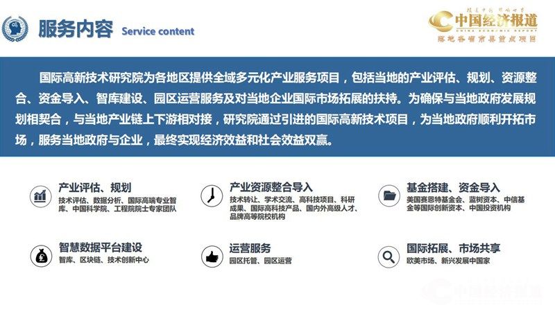 国际高新技术研究院为各地区提供全域多元化产业服务项目,包括当地的产业评估、规划、资源整 合、资金导入、智库建设、园区运营服务及对当地企业国际市场拓展的扶持。为确保与当地政府发展规 划相契合,与当地产业链上下游相对接,研究院通过引进的国际高新技术项目,为当地政府顺利开拓市场,服务当地政府与企业,最终实现经济效益和社会效益双赢。