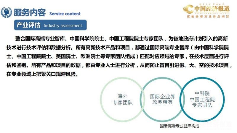 整合国际高端专业智库、中国科学院院士、中国工程院院士专家团队,为各地政府计划引入的高新 技术进行技术评估和数据分析。所有高新技术产品和项目,都通过国际高端专业智库(由中国科学院院 士、中国工程院院士、美国院士、欧洲院士等专家团队组成)匹配对应领域的专家,在技术层面进行评 估和鉴别。所有产品和项目的数据,都由专业人士进行分析,从而防止盲目引进假、大、空的技术项目, 在专业领域上把紧关口规避风险。