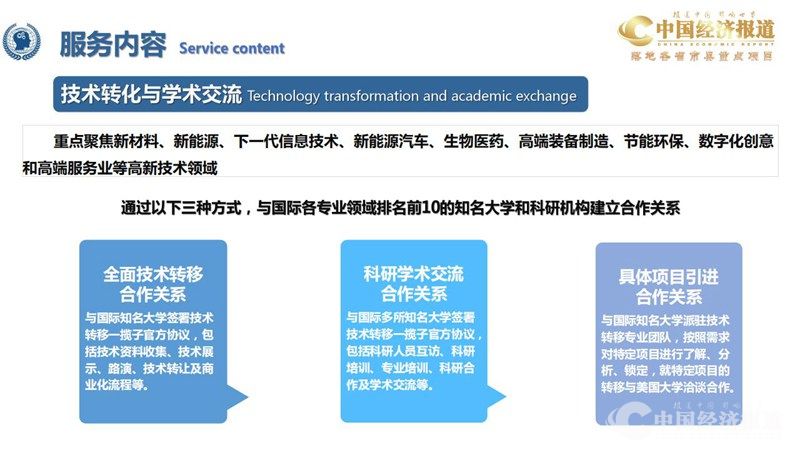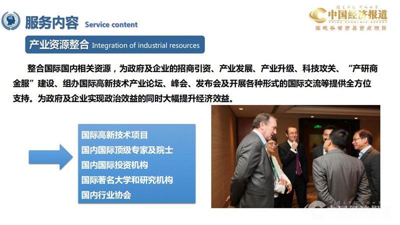整合国际国内相关资源,为政府及企业的招商引资、产业发展、产业升级、科技攻关、“产研商 金服”建设、组办国际高新技术产业论坛、峰会、发布会及开展各种形式的国际交流等提供全方位 支持。为政府及企业实现政治效益的同时大幅提升经济效益。
