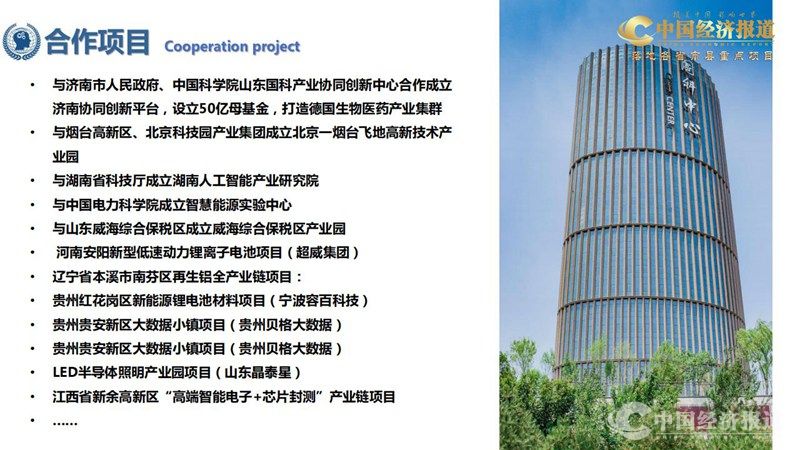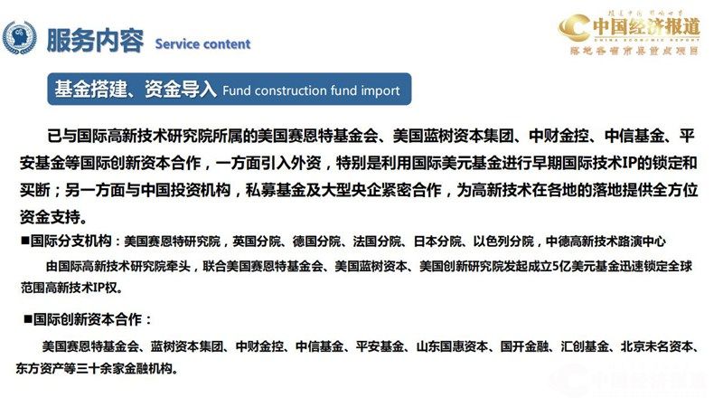 已与国际高新技术研究院所属的美国赛恩特基金会、美国蓝树资本集团、中财金控、中信基金、平 安基金等国际创新资本合作,一方面引入外资,特别是利用国际美元基金进行早期国际技术IP的锁定和 买断;另一方面与中国投资机构,私募基金及大型央企紧密合作,为高新技术在各地的落地提供全方位 资金支持。