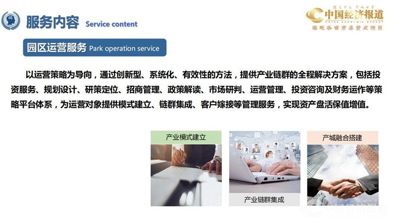 以运营策略为导向,通过创新型、系统化、有效性的方法,提供产业链群的全程解决方案,包括投 资服务、规划设计、研策定位、招商管理、政策解读、市场研判、运营管理、投资咨询及财务运作等策 略平台体系,为运营对象提供模式建立、链群集成、客户嫁接等管理服务,实现资产盘活保值增值。