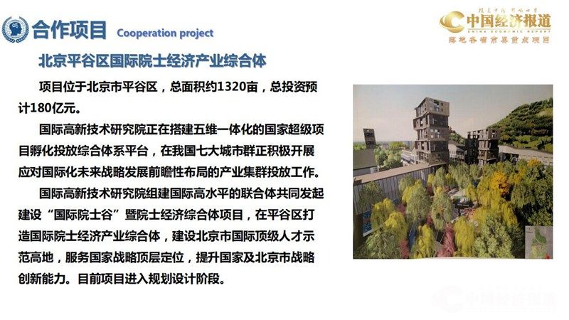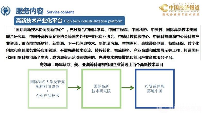 “国际高新技术协同创新中心”,充分整合中国科学院、中国工程院、中国科协、中关村、国际高新技术美国 联合研究院、中国外商投资企业协会等国内外各产业化专业协会、中德科技转移中心、中德科技路演中心等科技产 业资源,重点聚焦新材料、新能源、新能源汽车、下一代信息技术、人工智能、节能环保、高端装备、生物医药、数字化创意等高新技术领域,开展先进技术交流、转移转化、智库服务、产业育成和成果展示等工作,打造国际 化应用型科技创新全生态,成为具有示范引领效应的、先进技术的集散地和前沿产业育成服务平台。