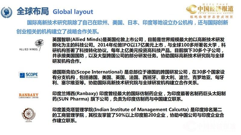 国际分支机构:美国赛恩特研究院,英国分院、德国分院、法国分院、日本分院、以色列分院,中德高新技术路演中心 由国际高新技术研究院牵头,联合美国赛恩特基金会、美国蓝树资本、美国创新研究院发起成立5亿美元基金迅速锁定全球 范围高新技术IP权。