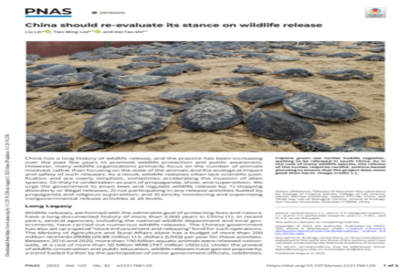 中经总网·中经在线特别报道(闫晓亮)8月8日,海南师范大学生命科学学院林柳副教授为第一作者,史海涛教授为通讯作者的文章 “China should re-evaluate its stance on wildlife release”(中国应重新审视野生动物放生问题),在国际顶级期刊PNAS上发表(链接:https://www.pnas.org/doi/10.1073/pnas.2221766120)。该文针对目前野生动物放生普遍存在的乱象及生态与社会危害,在法律法规、监督管理、政府示范等方面指出问题所在,给出管理举措。