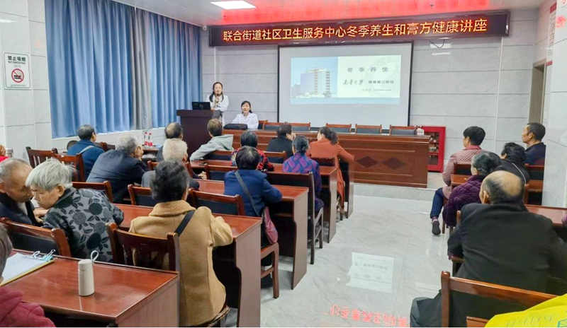 活动现场,来自南华大学附属第二医院中医科匡博士和食疗专家尚医生组成的健康宣教医疗队配合联合街道社区卫生服务中心工作人员,采取了现场讲座、居民提问等互动方式,积极投身此次“冬季养生和膏方健康宣教知识”活动中;重点介绍了“冬季养生”、“食疗药膳养生”、“冬病夏治和夏病冬治养生”、各种时令疾病的预防保健措施,慢性病的防治等群众易于接受且行之有效的养生方法。讲座现场气氛活跃,听课的居民多次报以热烈的掌声。讲座结束后,现场还开展了义诊、健康咨询等服务活动。据统计,此次义诊累计为近50余名居民提供了医疗服务,发放各类健康教育宣传资料500余份,免费发放健康礼品50余份。