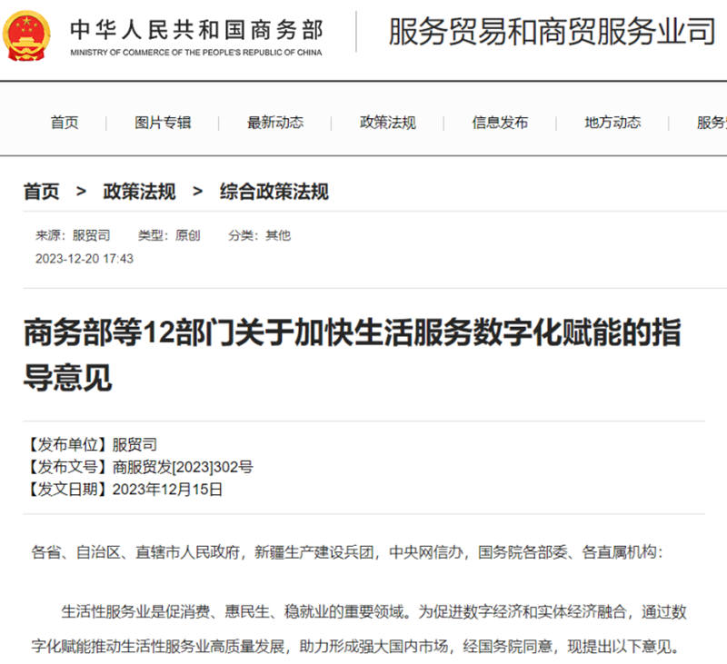 商务部等十二部门出台《关于加快生活服务数字化赋能的指导意见》