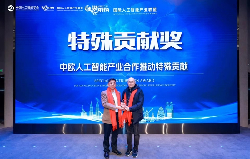 为表彰在人工智能研究学术界享有极高的声誉和国际化的影响力,多年在中欧两地奔走,积极推动人工智能产业落地的欧洲科学院院士Schahram Dustdar,论坛邀请了广东省科学院控股有限公司副总经理肖仁俊为其颁发特殊贡献奖。