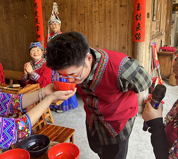 随后的节目是,一起互动参与了畲乡婚嫁大礼仪式。新郎吉力阿不多来自新疆,换上新郎服装后,春风得意,容光焕发,似乎马上进入了角色,按捺不住心中的兴奋,对着镜子连连自我欣赏并自拍,美美地自我陶醉了一回。四个伴郎换上服装后也放下了矜持,立马进入角色。