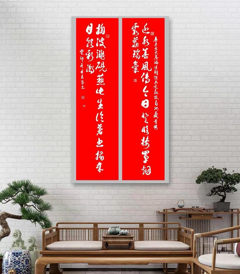 众所周知,从老祖宗发明甲骨象形文字开始,形,便成为了字的灵魂,以形塑意境,这是书法作品的一大特点。王成志将军在遵循继承这一特点时,也大胆融入了自己的想法,敢思,敢想更敢实践。比如他上联中的“烟”,右边的火字似熊熊燃烧的火焰,下面的零星碎笔,也似几簇星星点点的小火苗,在向上燃烧的过程中,逐渐加粗加重进而形成燎原之势。烟字右边的因与下面“霞”字上面的雨字头,又出现了字尽意连的奇观。王将军通过写意,将这二字的意境,通过近乎蒙太奇的手法,将云烟缭绕的飘渺,尽情地展现于读者,吸引着读者想更进一步的拨云雾而探其真。