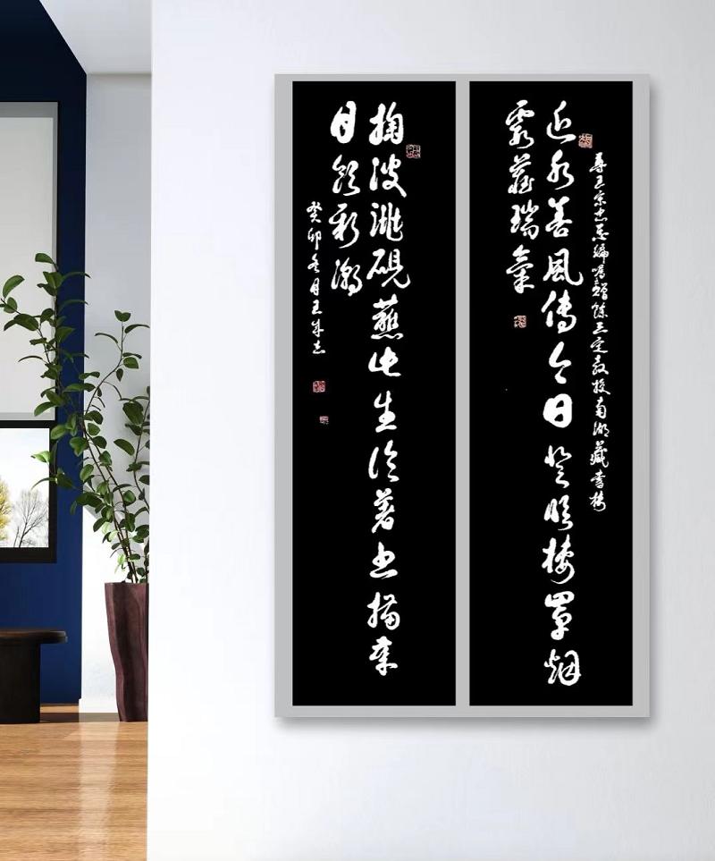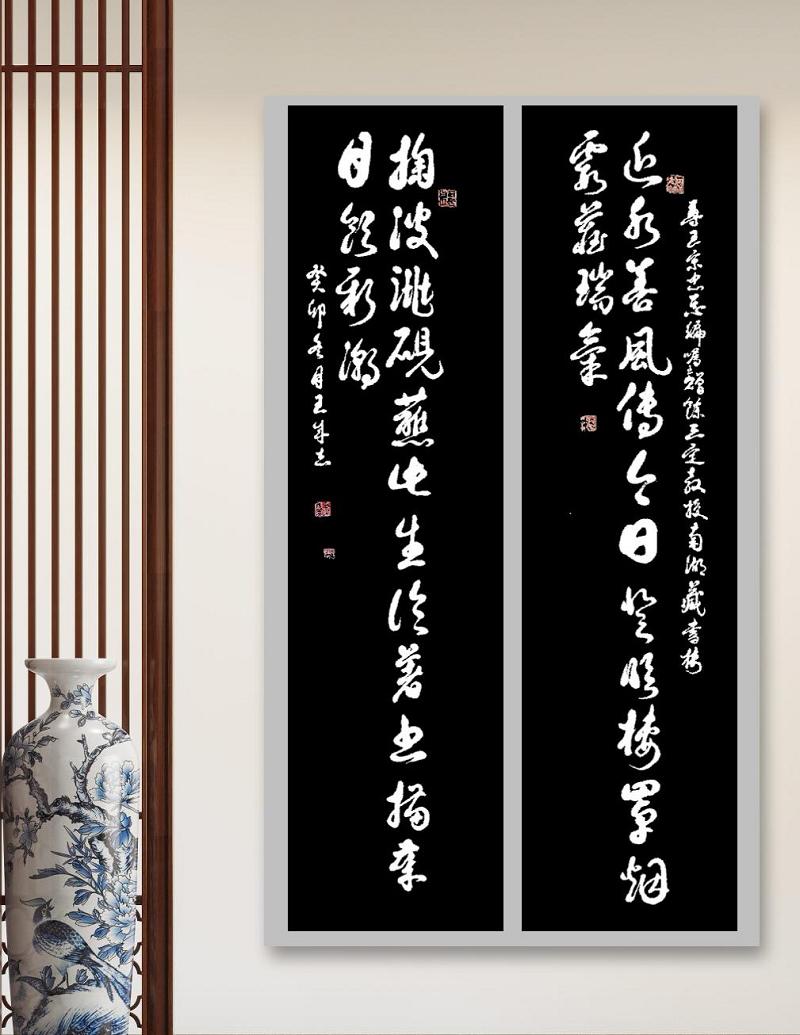 下联的第一个清字左边的三点水,起笔一顿,大有一石击起千重浪之势也,宛如一块补天之石,落入清澈湖面,瞬间溅起无数浪花,待涟漪渐渐扩散,慢慢消失,镜水无痕,右边的青字便宛如湖面上倒映的起伏叠嶂的山峦。一动一静间,我们即感受到了喷薄欲出的气势,又感受到了处之泰然的气度,究其根源,我想,这也是书法作者自身胸襟的气势与气度吧。