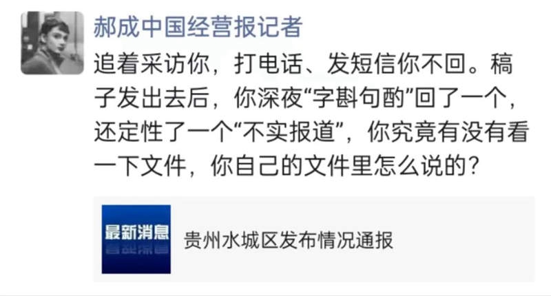 1.发稿前,我联系了六盘水市水城区区长、检察长、法院院长、地方平台公司董事长等人,要求他们讲一下情况,尤其希望他们回应一下为何过亿的债务,只给1200万元(前面一次是说给1500万元),这个问题,也给他们逐一短信了。而我的手机号,是报社公开过的,所以不存在没法核实我身份这一说法,但他们任何人都没有回应过。