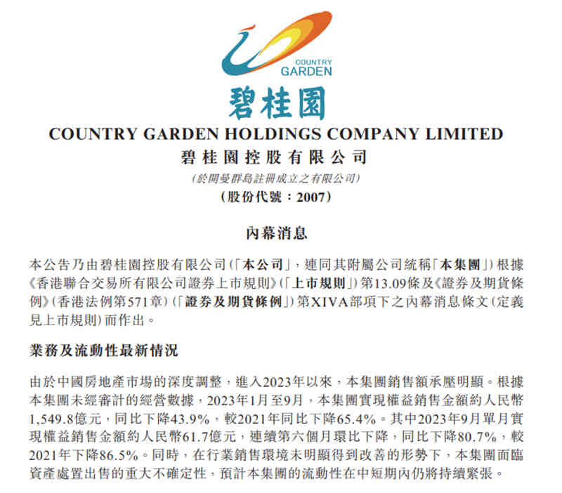 公告披露,根据集团未经审计的经营数据,2023年1月至9月,集团实现权益销售金额约人民币1,549.8亿元,同比下降43.9%,较2021年同比下降65.4%。其中2023年9月单月实现权益销售金额约人民币61.7亿元,连续第六个月环比下降,同比下降80.7%,较2021年下降86.5%。