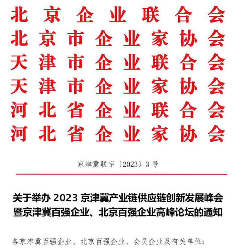 为深入贯彻落实党的二十大关于着力提升产业链供应链韧性和安全水平的重大决策和战略部署,全面深入贯彻落实习近平总书记在深入推进京津冀协同发展座谈会上的重要讲话精神,引导京津冀企业特别是大企业,主动践行高质量发展,在推动经济持续回升向好中展现更大担当作为,全面推进京津冀协同发展再上新台阶,经研究决定于2023年11月9日至10日在北京市举办“2023京津冀产业链供应链创新发展峰会暨京津冀百强企业、北京百强企业高峰论坛”。本次峰会由中国企业联合会、中国企业家协会指导,北京企业联合会、北京市企业家协会主办,天津市企业联合会、天津市企业家协会,河北省企业联合会、河北省企业家协会联合主办,中关村中慧先进制造产业联盟承办,主题为“推进京津冀产业链协同 助力企业高质量发展”。