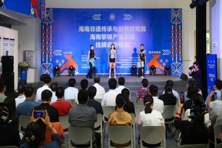 开幕式上,张华伟、崔莹、刘成、许玫、杨兹举和黎族传统纺染织绣代表性传承人符雪燕共同为海南非遗传承与创新研究院、海南黎锦产业联盟挂牌。