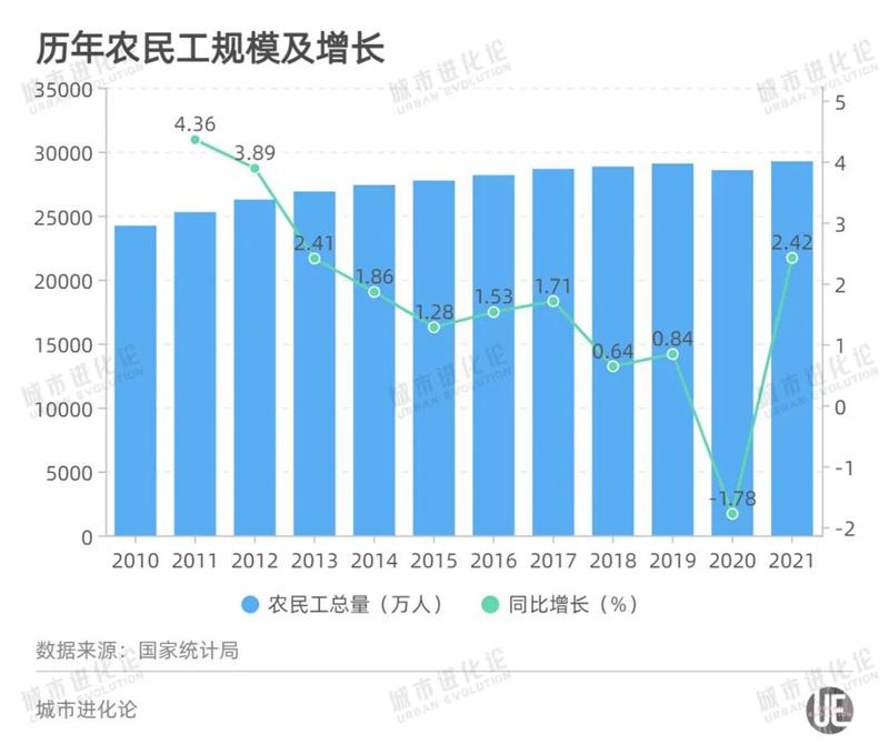 总量还在增长,但是增速已经减缓了。2021年,全国农民工总量29251万人,与2019年相比只增加174万人。