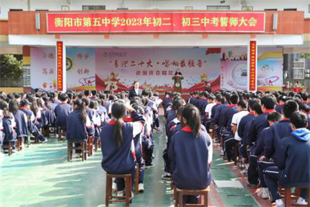 衡阳市第五中学党委书记蒋受佐为大会致词,代表学校向辛勤工作的初二、初三老师们表示衷心的感谢,向奋力拼搏的同学们表达美好的祝愿。他表示会考的号角已经吹响,中考的战鼓已经擂响,师生们要为即将到来的会考做好充分的准备。“行百里者半九十”,这一百天有着非凡的意义,要坚持到底,不断拼搏!