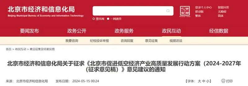 日前,北京市经信局发布关于征求《北京市促进低空经济产业高质量发展行动方案(2024-2027年)(征求意见稿)》意见建议的通知。