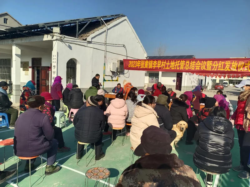 作为张黄镇首批响应当党和政府土地流转政策,与企业签订土地流转协议的村。在保证村民最低1000元收入的基础上,通过加强土地管理,实现了增收创利,积极回馈百姓,召开了土地托管总结暨分红发放大会,赢得了百姓的好评。