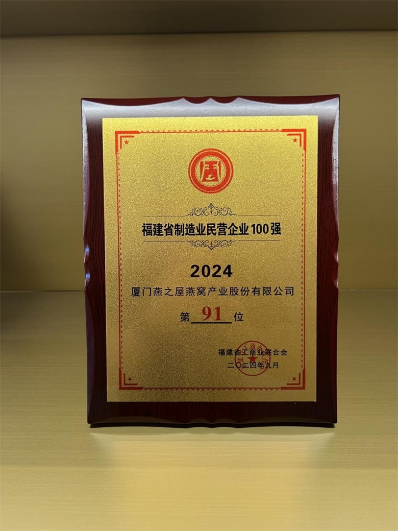 近日,福建省工商联发布2024福建省制造业民营企业100强榜单,表彰在福建省民营经济领域具有卓越贡献和影响力的企业,燕之屋实力上榜,位列第91位,不仅彰显了其在燕窝行业的引领地位,也进一步巩固了其在福建省民营企业中的重要地位。
