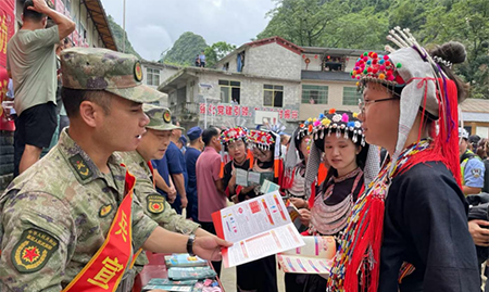 中经总网·中经在线广西巴马讯 今年是庆祝中国人民解放军建军97周年,进一步弘扬拥军优属优良传统,营造爱国拥军、尊崇军人的浓厚社会氛围。近日,广西巴马瑶族自治县东山乡将慰问和征兵宣传结合在一起,通过召开“八·一”座谈会、走访慰问辖区退役军人的形式,多方位、多层次、多渠道开展秋季征兵宣传活动,激发适龄青年参军入伍的热情,全覆盖营造“一人当兵,全家光荣”的浓厚氛围。
