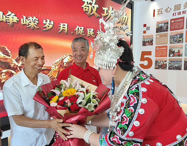 7月29日上午,一场别开生面的“庆八一,鲜花献功臣——忆峥嵘岁月,促民族团结”活动拉开序幕,享誉全省的“锦都繁星民族工作室”负责人张莉为荣获一等战功、首都卫士等荣誉称号的王化悟敬献鲜花,身穿民族盛装的姑娘们分别为卢茂星、丁智民、杨露萍等退役军人代表献鲜花,预祝建军节快乐,参加活动的代表和民族同胞报以热烈的掌声。