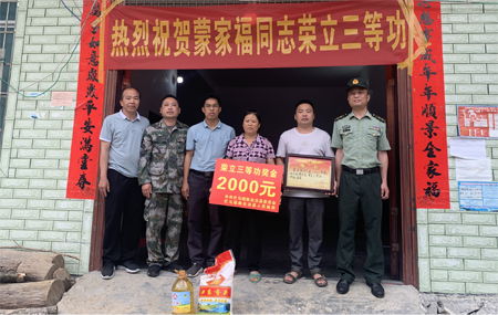 中经网·中经在线广西巴马讯 5月5日上午,广西巴马瑶族自治县人民武装部、自治县退役军人事务局、东山乡人民武装部等领导一行到东山乡村民蒙海峰家,将其儿子蒙家福在部队获得“三等功”喜报送到家中。蒙家福是2013年入伍的一名现役军人,在部队先后荣获了3次“四有”优秀士兵荣誉称号。2022年因工作表现突出荣立三等功,是该乡有史以来获得最高荣誉。自治县人武部副部长姚宇对蒙海峰夫妇表示感谢和慰问,同时送去了党委、政府的关怀,感谢他们为部队培养了优秀人才,为国防建设事业作出了积极贡献。