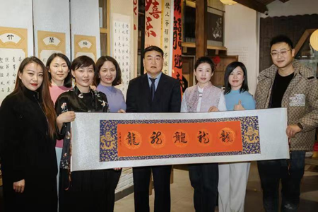 中经总网·中经在线山东青岛讯 翰墨飘香书盛世,金龙迎春纳吉祥。元月31日下午,由“中卓书院”和“寸园问茶”茶馆联合举办《翰墨书新岁·寸园风雅汇》,书法家李增波携弟子迎新春送“福”活动在青岛西海岸“寸园问茶”展毫舒墨。