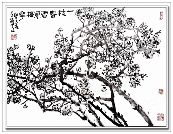 近年来,章龠中老师在保留他擅长国画繁茂花卉构图的特色外,也研习八大山人的禅意画梅笔法,疏密有度,大道至简的长处。用笔苍健有力,线条粗犷,多方硬曲折。施墨枯润结合,富有超强的表现力,让寒梅正侧偃仰,千姿百态,犹如万斛玉珠撒落在银枝上。白洁的花朵与铁骨铮铮的干枝相映照,清气袭人,深得梅花清韵。