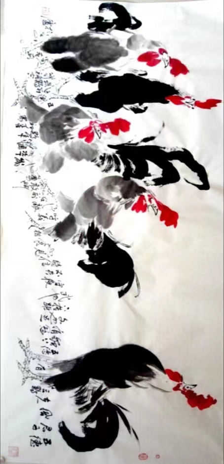 传统文人画讲究题跋,其跋的内容、置放的位置和采用什么样的书体都是要经过一番深思熟虑的研究,方能见于纸上。而“跋”一般又是一首诗或一段人生感悟,它并不是一般意义上的景物释义,而是对景物的润意,是主题思想的升华。有时,“跋”还是画面布局的构架之一,起到画龙点睛的作用。因为“跋”并不是一味地要去补白填空,而是画家在创作之前精心埋下的伏笔。一个好的题跋不但能使画面的意境意味深长,而且还能给作品带来意想不到的空间审美效果。其作品《五德君子风》便是如此。该作品以行草笔法入画,勾勒以墨韵见胜,强调用笔意趣,笔墨干净利落,且用笔潇洒,大有一气呵成之势。通过浓淡枯湿的墨色变化彰显物象的虚实动静,其墨色苍润,笔法凝练。只见画面上的五只公鸡意气风发、斗志昂扬,展示出蓬勃向上的生命力量。画家以画面右方公鸡的引吭高歌带出主次关系,四君纷纷朝向它,你呼我应,眉目传情,不但带出了节奏,还将层次和空间结构呈现出来。根据整体运动倾向,以横向取势,画面视野开阔,冲和淡远,其谋篇布局沿用文人画的理念,将题跋似如草景,不但平添了亮色,还为五只站立的公鸡找到了重心,也使整幅画找到了一个平衡的支点。值得一提的是画家对冠的处理也颇费心思。五只公鸡有五种不同的样式,各具特色,起到了妙笔生花和画龙点睛的作用,也使得整幅画充满了唯美主义的浪漫情怀。在这幅作品里,画家寄予物象拟人化,惯以画中五只公鸡以“君子”之称,不为“群鸡图”,而为“五德君子风”,通过题跋对君子的界定进行了重新释义。