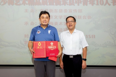 中经总网·中经在线湖南衡东讯(张星兴 通讯员 王峥 边冬宇)近日,“云彰深处・洣水流韵”——陈少梅艺术精品展暨衡东县中青年10人书法展在湖南省衡东县陈少梅美术馆开展,衡东县委副书记、县长蒋崇华宣布展览开幕,并向陈少梅孙辈米川现场颁发收藏证书以及陈少梅美术馆荣誉顾问证书。