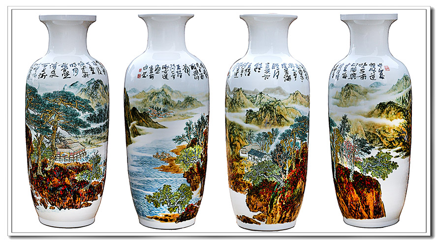 王维《汉江临眺》中 "江流天地外,山色有无中" 的朦胧意境,与高温颜色釉 "自然肌理" 的随机变幻有着天然的精神契合。书法作品由浙派书画名家章龠中创作,瓷画则是由宋韵山水画家谢古道执笔,二位艺术家已合作过多次,且深谙此道,谢老师在创作中巧妙运用单色釉与复色釉的交融,让瓷瓶的釉色成为诗歌意象的物质载体。画面中,象征汉江边的山体岩石部分以 "祭红" 为底,这种最难驾驭的单色釉在高温下呈现出从深红到浅紫的渐变,恰似一抹晚霞洒落在山岩上流动的色泽 —— 近岸处如凝血般厚重,江心则泛着紫罗兰色的粼光,正应了 "郡邑浮前浦" 中水波荡漾的视觉感受。