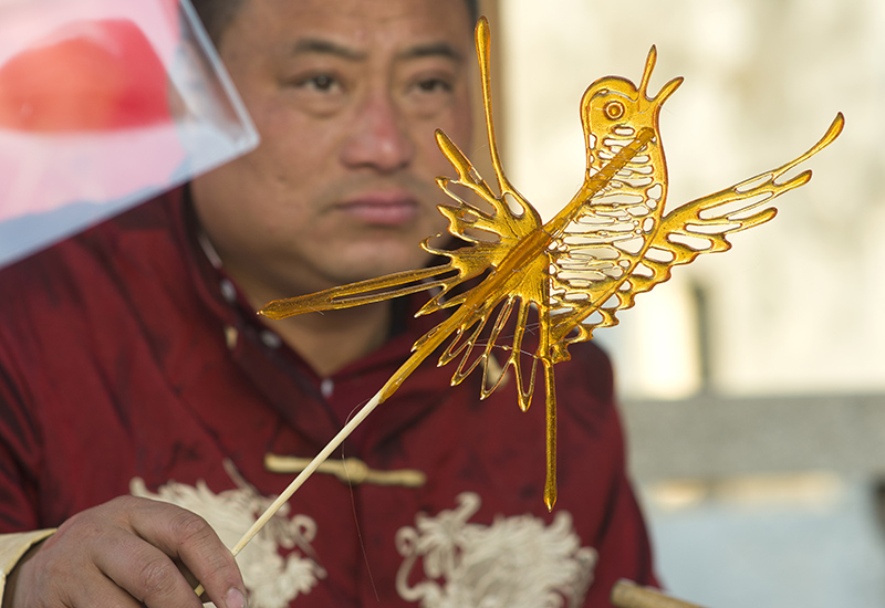 50 岁出头的糖画师傅,神情专注,手持铜勺,琥珀色的糖浆在他手中的铁板上自如流转,不过须臾之间,一条跃鲤摆尾的灵动模样便跃然板上,紧接着,又一个玉兔捣药的精巧造型诞生。一旁,妻子热情地招呼着客人,将做好的糖画轻轻插在草把上,晶莹糖画与古街景色相映成趣。