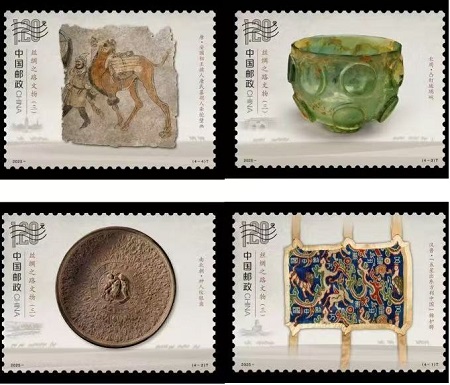 据了解,该套邮票画面主体突出、细节清晰,印制工艺设计巧妙,根据四种文物的特色,运用“多色高精度胶印+特种工艺”的组合形式,打造视觉、触觉多维度鉴赏体验,展现了丝绸之路文物的精美工艺和艺术特色。在紫外灯下欣赏,分别呈现出独特视角下的荧光效果。背景采用类似古旧纸张的色调,以特种光泽性油墨的烘托,描绘了古丝绸之路沿途景观及行商驼队,驼队方向与文物的流通方向相呼应,营造悠远的历史文化氛围。