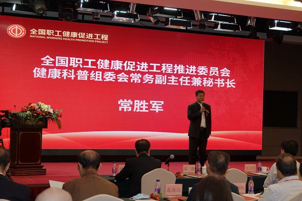 全国职工健康促进工程推进委员会、健康科普组委会常务副主任兼秘书长常胜军宣读《健康知识普及培训学习活动倡议书》(中经报道王海珠/摄)
