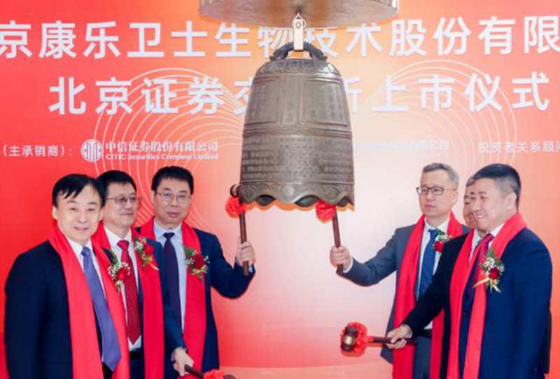 北京经开区迎来企业上市“开门红”,区内生物医药企业北京康乐卫士生物技术股份有限公司(以下简称康乐卫士)在北京证券交易所(以下简称北交所)敲响了登陆资本市场的钟声,成为经开区2023年第一家上市企业,同时也是经开区首家北交所上市企业。