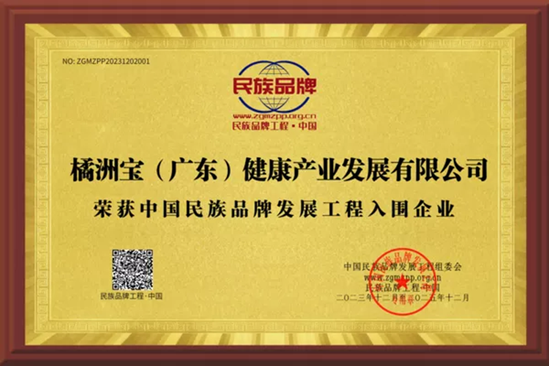 经中国民族品牌发展工程组委会专家评审,橘洲宝(广东)健康产业发展有限公司荣获中国民族品牌发展工程入围企业,为民族品牌赋能,树立民族品牌形象,实现民族品牌核心价值观 。